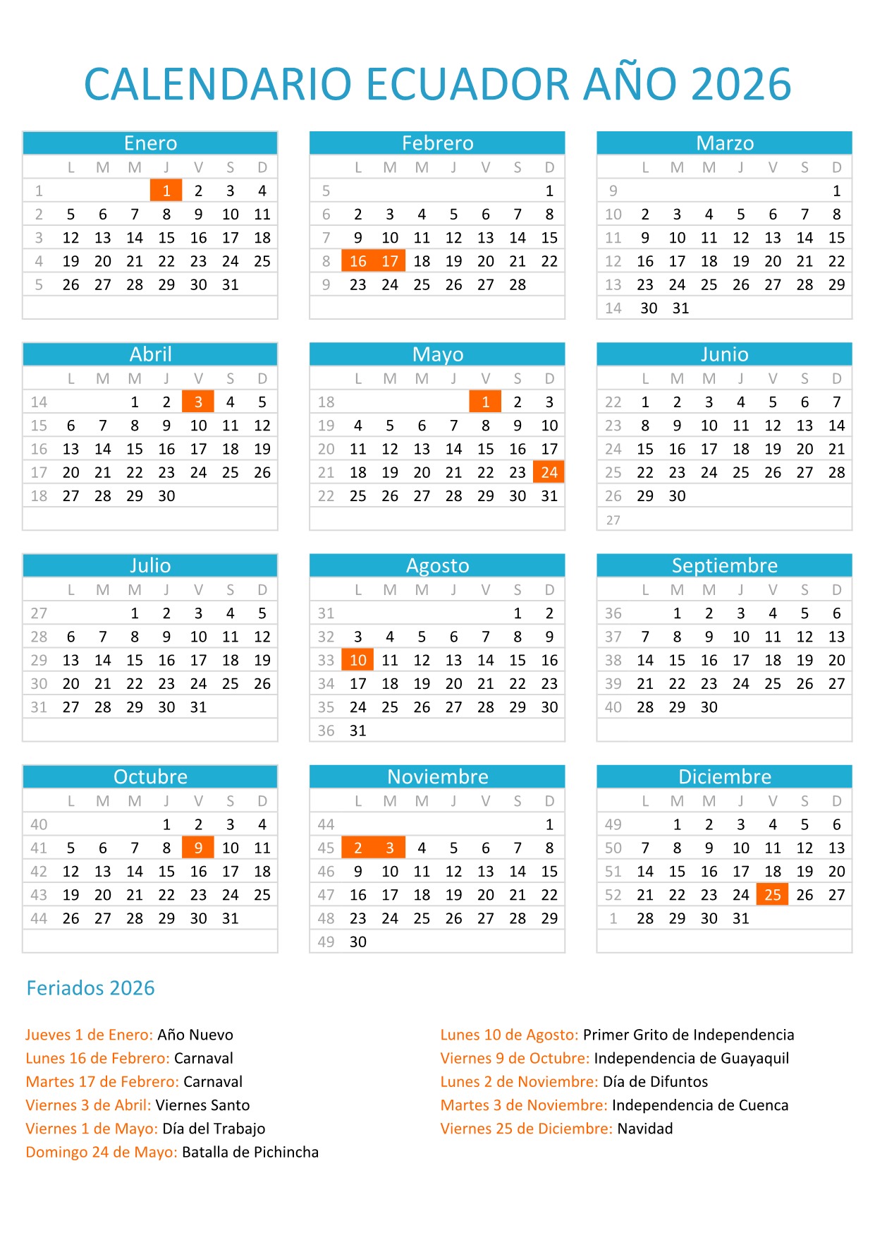 Calendario Ecuador 2026 con Feriados Oficiales y Fechas Importantes