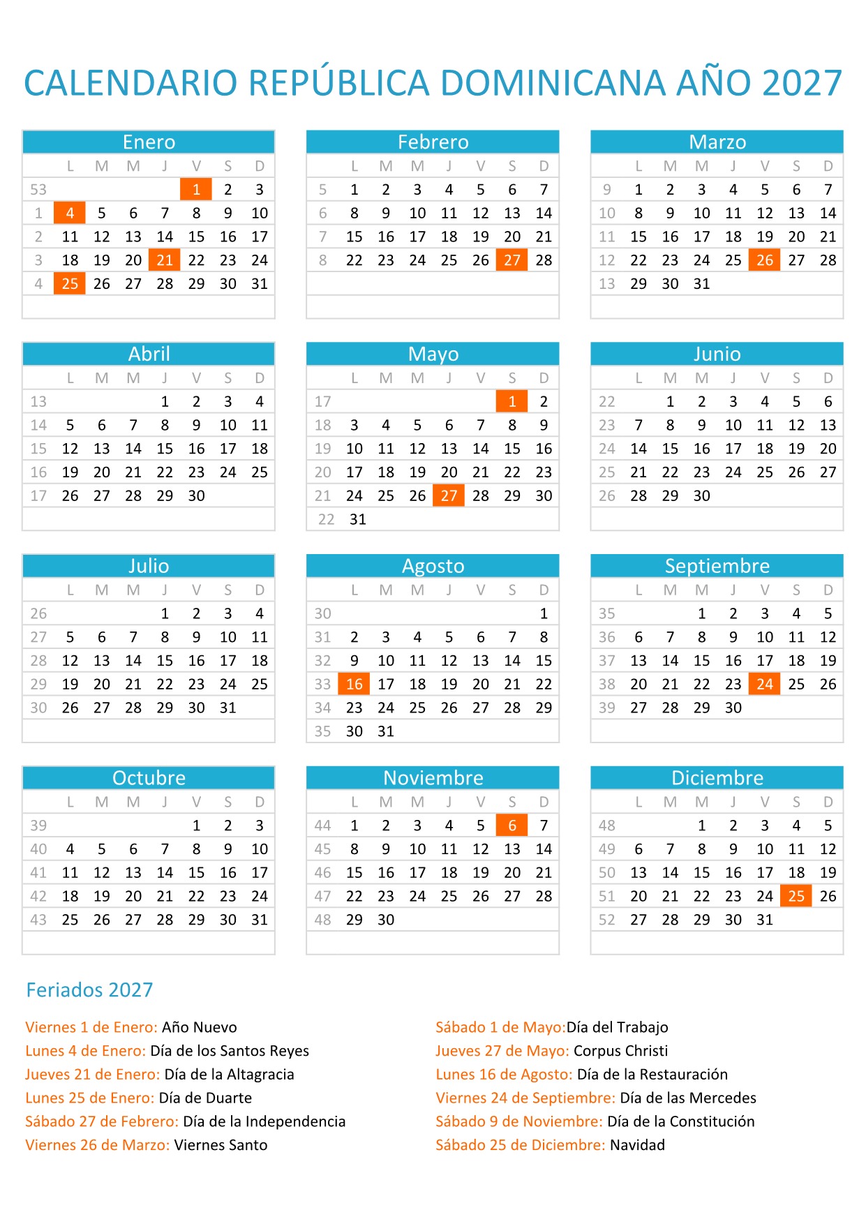 Consulta el calendario de la República Dominicana 2027 con todos los días festivos y feriados oficiales. ¡Organiza tu año de manera fácil y práctica!