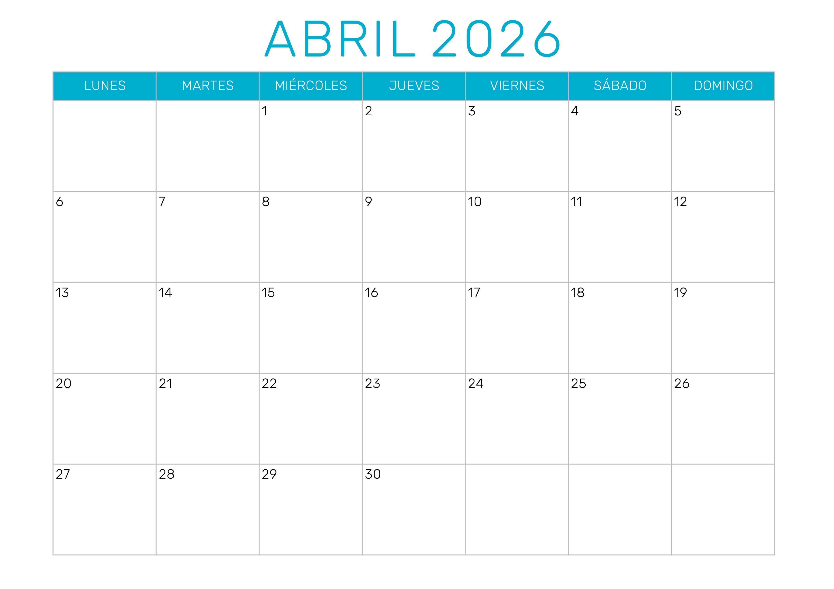 Descargar calendario abril 2026 en PDF Descargar calendario abril 2026 en JPG Descargar calendario abril 2026 en Excel¿Cuántos días tiene abril 2026?