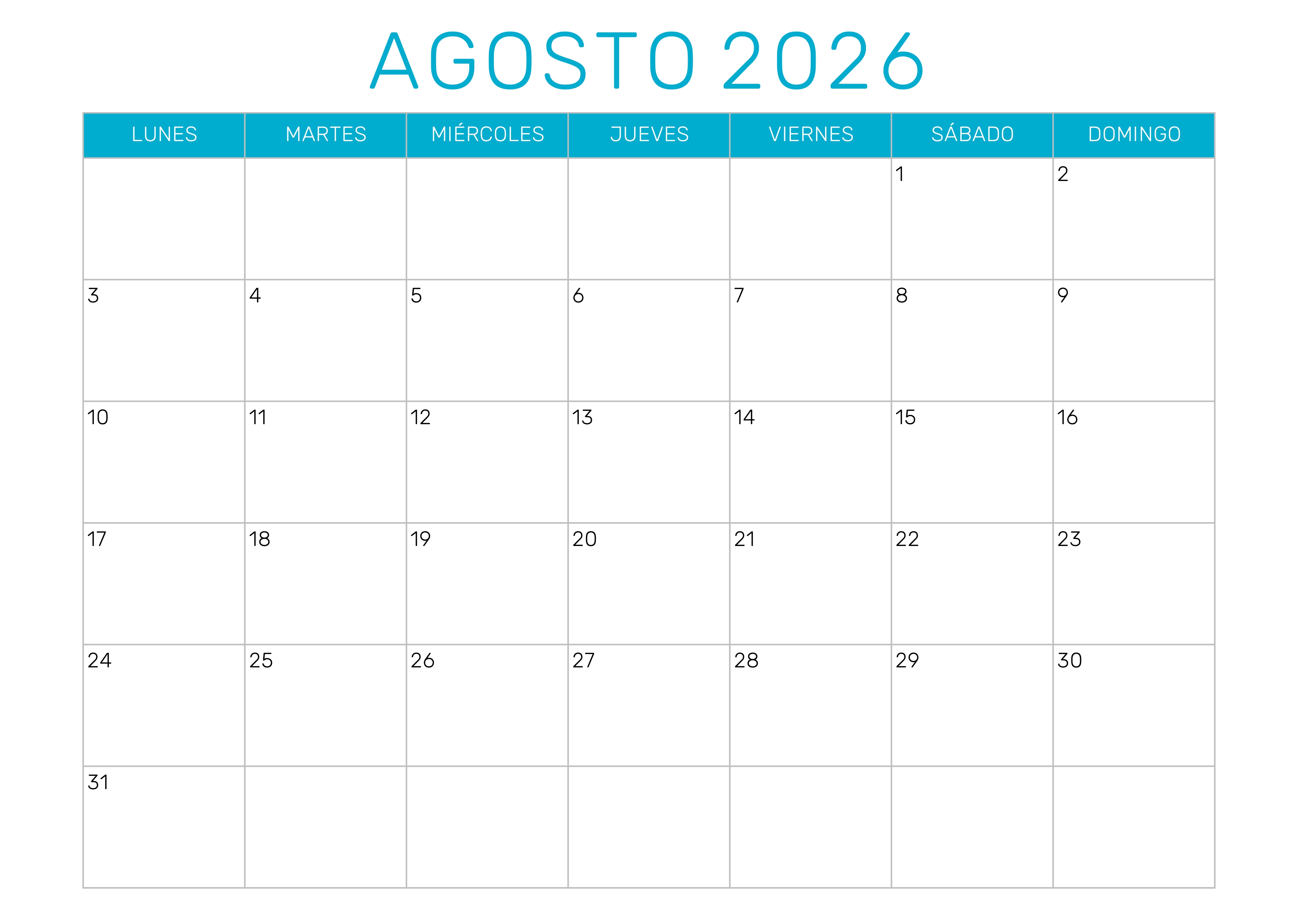 Descarga el calendario agosto 2026 para imprimir en formato PDF, JPG o Excel. El calendario 2026 agosto incluye todos los días del mes organizados en un diseño claro y práctico para planificar tus actividades personales, laborales o académicas.