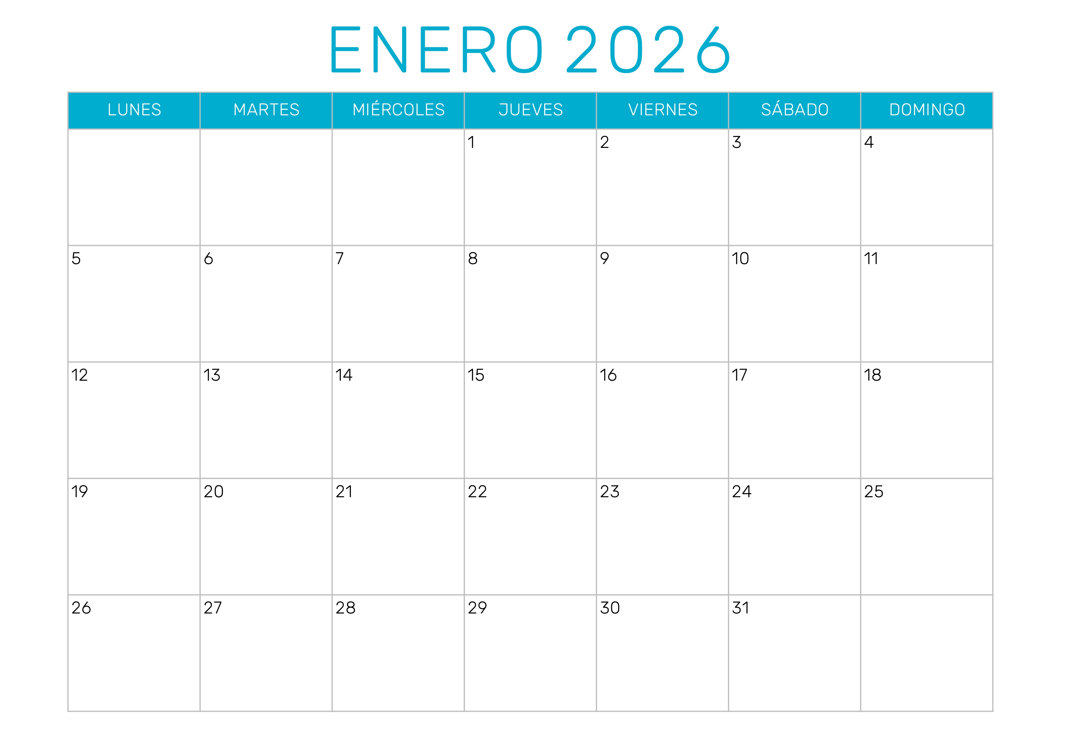 Descarga el calendario enero 2026 para imprimir en formato PDF, JPG o Excel. El calendario 2026 enero incluye todos los días del mes organizados en un diseño claro y práctico para planificar tus actividades personales, laborales o académicas.