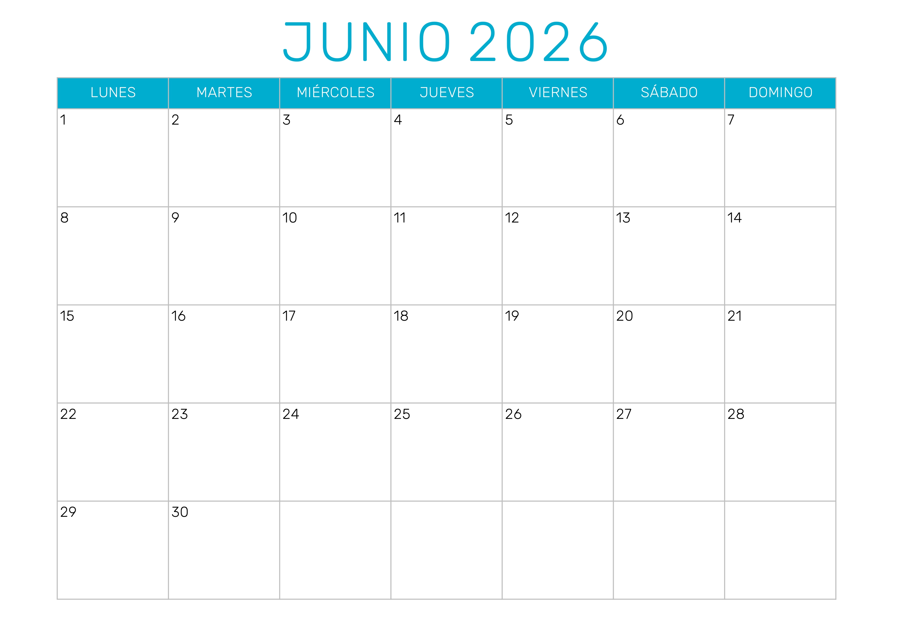 Descargar calendario junio 2026 en PDF Descargar calendario junio 2026 en JPG Descargar calendario junio 2026 en Excel¿Cuántos días tiene junio 2026?