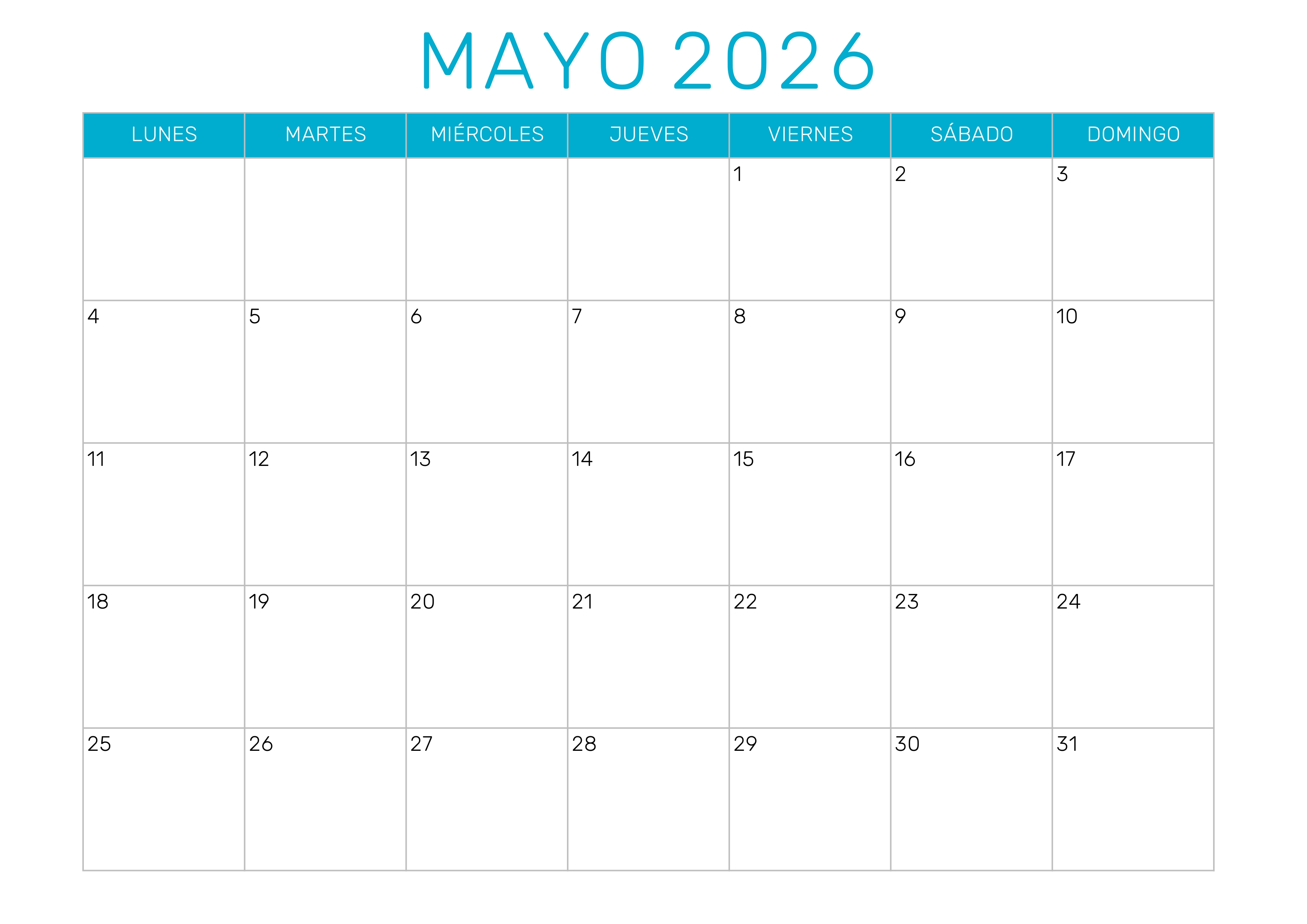 Descarga el calendario mayo 2026 para imprimir en formato PDF, JPG o Excel. El calendario 2026 mayo incluye todos los días del mes organizados en un diseño claro y práctico para planificar tus actividades personales, laborales o académicas.